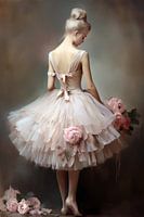 Romantisch klassiek portret van een ballerina in een oudroze tutu met roze rozen.