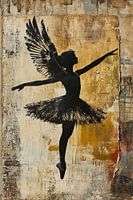 Ballerina - Dit is een modern kunst schilderij waarop een silhouet van een ballerina met vleugels staat, tegen een achtergrond met versleten, gelaagde, abstracte texturen in aardetinten.