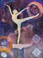 Deze monotype is gemaakt met een gelliplate. Een uniek en eenmalig werk, er kan maar 1 afdruk worden gemaakt van je ontwerp. Door de druktechniek en het gebruikte papier ontstaan er allerlei structuren en effecten. Abstract werk met ballerina en portret, in koele en warme kleuren.