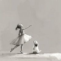 Het meisje, gekleed in een wervelende ballerinajurk, glimlacht terwijl ze haar armen sierlijk spreidt. Haar hond, met een kwispelende staart, kijkt liefdevol naar haar op.