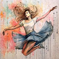 Vierkant kunstwerk van een ballet danseres die een sierlijke sprong in de lucht maakt. Door ai gegenereerd kunstwerk in oranje, blauw beige, geel en roze tinten.