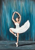 Ballerina schilderij, zwanenmeer. Danseres in witte elegante jurk dansend op de punt haar spitzen op het podium. Haar witte jurk en gebalanceerde figuur staan in een prachtig contrast op de donkerblauw grijze achtergrond