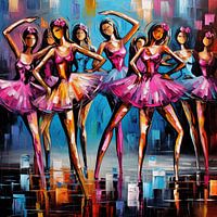 In dit betoverende kunstwerk komen de danseressen tot leven in een samenspel van kubistische vormen en levendige pop art kleuren. Geometrische lijnen en hoeken vangen de essentie van hun bewegingen, terwijl felle tinten het podium verlichten met een explosie van energie.