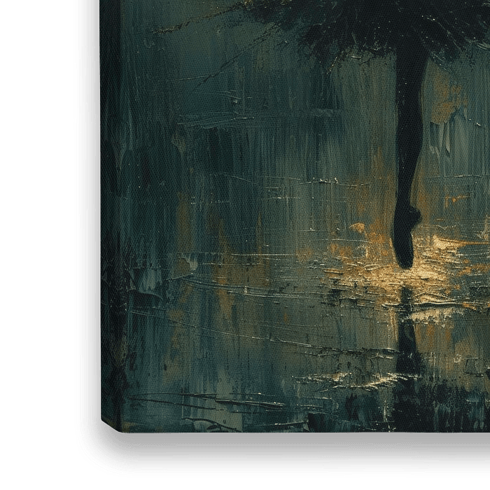 Dit trendy, intieme kunstwerk toont een ballerina van achteren, in een danspose met één been geheven en haar armen sierlijk boven haar hoofd. De ballerina staat in het midden van het doek, waardoor ze het brandpunt van de compositie wordt. Haar tutu is zwart en gedetailleerd met expressieve verfstreken die een gevoel van beweging en…