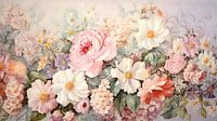 Dit schilderij presenteert een rijk boeket van bloemen in een scala aan pasteltinten, die harmonieus samenkomen tegen een zachte achtergrond.