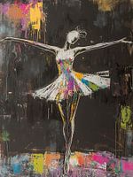Balletdanseres - Dit vrouwen schilderij toont een gestyleerde, kleurrijke balletdanseres in een dynamische pose tegen een donkere, abstracte achtergrond, waardoor beweging en expressie centraal staan.