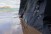 Rots aan de kust bij Ballintoy Secret Beach, Noord-Ierland. Op de donkere rots zijn een aantal zeeslakken te zien. In de verte ligt een eiland begroeid met korstmossen.