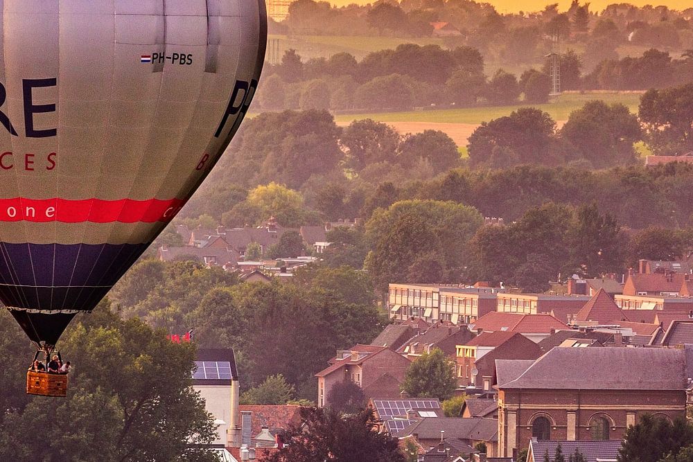 Een ballon die tijdens zonsondergang aan de Gulperberg voorbij drijft in de richting van het dorp Wijlre in Zuid-Limburg.