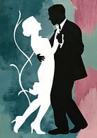 Een abstract schilderij van een gekleed stelletje dat aan het stijldansen is.