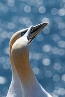 Op de kliffen van Helgoland nestelt in het voorjaar een grote kolonie Jan-van-Genten. Op een zonnige dag maakte ik deze foto van twee baltsende vogels, met op de achtergrond de zee waarin het zonlicht wordt weerkaatst.