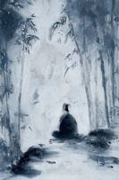 Bamboe Stilte toont een figuur in meditatie, zittend te midden van hoge, zachte bamboestammen. De compositie is losjes geschilderd, met ruwe penseeltextuur en een poederige korrel die het geheel een natuurlijk, haast verweerd karakter geeft. De figuur is bewust vaag gehouden, wat uitnodigt tot projectie en introspectie.