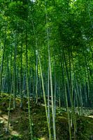 Bamboe bos in Arashiyama te Kyoto in Japan. Groene bamboe met blad en stok tijdens een zonnige lente dag. Met schaduw en licht speling tussen de bamboe.