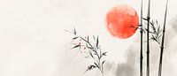 Zachte bamboestammen omlijsten een stralende rode zon die schijnt als een levend oog in de lucht. De eenvoudige, harmonieuze compositie straalt rust en zen uit. Dit artistieke motief is perfect voor een slaapkamer of leeshoek, waar het een vredige sfeer creëert en uitnodigt om te dromen.
