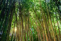 Bamboeplanten waar de zon doorheen schijnt. Je ziet de zonnestralen. Rustgevende foto.