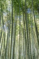 Op de foto is een bamboebos te zien, gelegen in het Shunan Zhuhai National Park, in de provincie Sichuan, China. De bamboestengels staan dicht op elkaar en reiken hoog de lucht in. De kleur van de bamboe varieert van lichtgroen tot bijna geel, wat zorgt voor een lichte, heldere uitstraling in de foto. Door de verticale lijnen van de stengels creëert het beeld een rustgevend en gestructureerd patroon, dat kenmerkend is voor een bamboebos. De bladeren aan de top van de stengels vormen een zacht bladerdak, dat het licht filtert en de hele foto een sereen gevoel geeft.