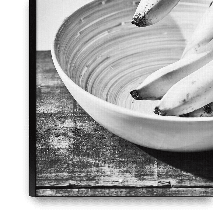 Vrolijk stilleven van schaaltje bananen met een buitenbeentje. Makkelijk inpasbaar door zwart/wit kleuren. Lekkere sfeer door zomers lichtje.