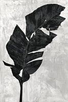 Elegant verticaal silhouet van een bananenplant in diepzwart tegen een gestructureerde grijs-witte achtergrond. Fijne lineaire details in de bladeren contrasteren met de schilderachtige achtergrond in impastostijl.