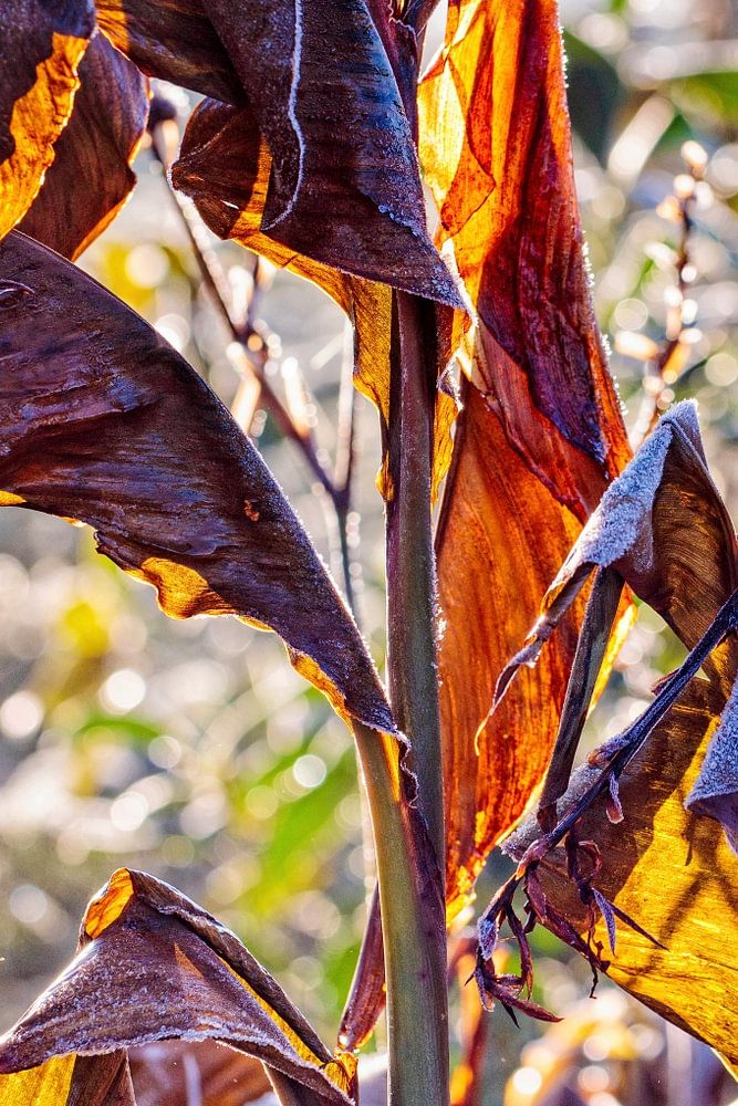 Close-up van een bananenblad in het tegenlicht op een koude ochtend met vorst aan de grond.