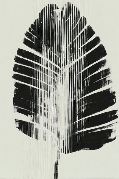 Een verticale studie van een tropisch blad waarbij de centrale nerf wordt gedefinieerd door een cascade van verticale witte lijnen met een "drip". Het contrast tussen de effen zwarte bladdelen en de vloeiende witte lijnen is scherp en modern.