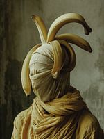 Dit fotorealistische fineart schilderij toont een surrealistisch portret van een figuur gehuld in zachte, okergele doeken die het gezicht en lichaam volledig bedekken. Het meest opvallende kenmerk is het hoofdtooi-achtige arrangement van rijpe, gebogen bananen die als een kroon uitsteken. De bananen, met natuurlijke imperfecties zoals…