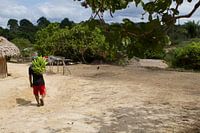 Een bewoner van het Trio dorp Alalapadu in zuid Suriname, dicht bij de grens met Brazilië, heeft een tros bananen geoogst van een bananenplant in het dichte oerwoud.