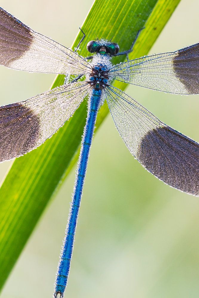 Een weidebeekjuffer man met open vleugels in het Limburgse Geleenbeekdal rond zonsopkomst in de zomer
