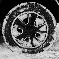 Autobanden na het rijden door hoge verse sneeuw in het Harz gebergte, Duitsland, kleverige natte sneeuw kleeft tussen de spaken van de velg, vervoer in de winter in een ernstige zwart-wit look