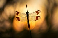 Ook deze foto is weer gemaakt tijdens een prachtige zonsopkomst. De libel licht mooi op door hem voor de zon te plaatsen. De dauw op zijn vleugels is zo ook mooi te zien.