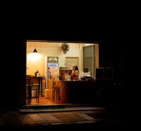 Een verkoopster in een eettentje wacht op klanten laat in de avond. Deze foto heb ik gemaakt toen ik terugkwam uit de stad laat op de avond. Ik vind de schaduw mooi in deze foto. Je wordt als het ware in de foto gezogen. Een kijkdoos in het groot.
