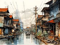 Een bruisende stad op het kruispunt van traditie en moderniteit. marktkramen vullen de straten. De Chao Phraya-rivier slingert door de compositie, met boten die zich een weg banen door het water. Neonlichten verlichten de nacht, en de geuren van streetfood zweven door de lucht. Een schets van Bangkok vangt de levendige chaos en de unieke harmonie van deze stad.