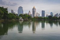 Reflectie van de skyline van Bangkok in Lumphini Park.