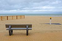 Een zitbank op de dijk aan het strand van Koksijde, België op een bewolkte dag.