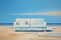 Een abstract schilderij van een zitbank op het strand in beige en blauw tinten. Rustige uitstraling.