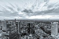 Zwart-wit foto wolkenkrabbers in het bankdistrict in Frankfurt.