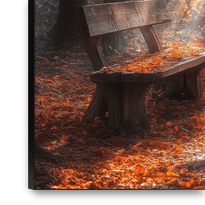 Midden in een gouden herfstbos schijnt zacht licht door de bomen en omhult een eenzaam bankje. De heldere, warme kleuren van de vallende bladeren nodigen uit om te blijven hangen en creëren een sfeer van rust. Ideaal voor de woonkamer om een ontspannen en inspirerende sfeer te creëren.