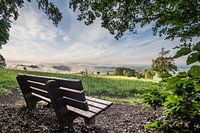 Bankje bij Berghäusl op een zomerochtend. Verder zicht naar het zuiden. De mist hangt in de valleien. De foto is grotendeels omlijst met bladeren.