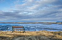 Een foto waar de rust vanaf spat... Een bankje op de rand van een klif in Borgarnes aan de westkust van IJsland met uitzicht op een deels drooggevallen zeearm en in de verte de bergen van Snaefellsnes.
