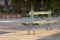Karakteristiek bankje in het Jardin des Tuileries, in de vroege ochtendzon.