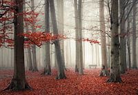 Bankje in mistig bos omringd door bomen met rode herfstbladeren.
