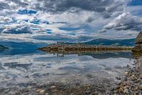 De reflectie van de wolken is goed te zien in het rustige water van het Innvikfjord.