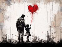 De illustratie belicht de emotionele connectie tussen de twee, met speelse lijnen en onverwachte wendingen die typerend zijn voor Banksy's kenmerkende stijl. De krachtige boodschap van liefde en bescherming wordt subtiel weergegeven, terwijl de kunstenaar zijn eigen interpretatie geeft van het kostbare moment van vaderlijke zorg.