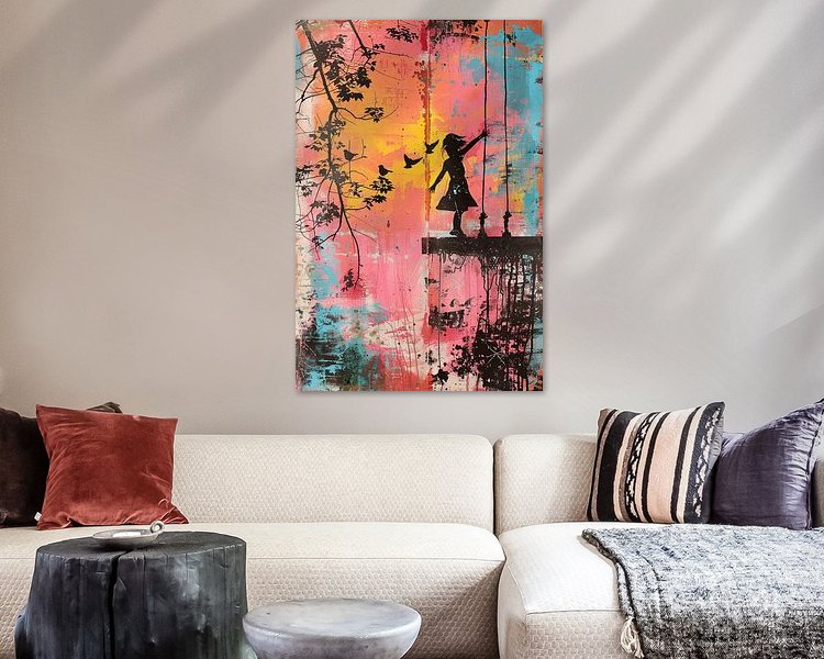 Dit opvallende kunstwerk vangt de essentie van vrijheid en jeugdige onschuld. Een meisje, geschetst in scherp silhouet, zweeft op een schommel, haar armen uitgestrekt alsof ze de wereld omarmt. Een zwerm vogels vliegt om haar heen, hun aanwezigheid voegt een vleugje magie en beweging toe aan het stuk. De levendige kleuren en gedurfde lijnen creëren een visueel feest dat elke ruimte zal opfleuren. Dit kunstwerk is een viering van de eenvoudige geneugten van het leven en een herinnering om de schoonheid in elk moment te vinden.
