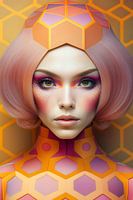 Futuristisch portret van een vrouw in retro stijl, met oranje en lila tinten en hexagoon vormen.
