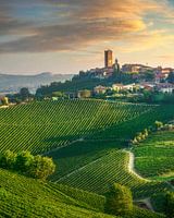Barbaresco dorp en Langhe wijngaarden bij zonsopgang, Unesco Werelderfgoed, regio Piemonte, Italië, Europa.