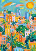 Dit kleurrijke schilderij verbeeldt Barcelona in de stijl van Henri Matisse en brengt de architectuur van Gaudí levendig in beeld. Kleurrijke gebouwen, palmbomen en blauwe koepels onder een oranje lucht worden benadrukt door krachtige penseelstreken. Fel zonlicht en harmonieuze kleurcomposities combineren realisme met een abstract…