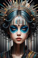 Een prachtig meisje, met een kroon van tribale accenten, heeft een streepjescode op haar voorhoofd, wangen en nek. De surrealistische stijl heeft een intense ceremoniële uitstraling. De blauwe oogmake-up maakt het een extra bijzonder futuristisch meisje. Het beeld is met behulp van ai gegenereerd.