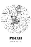Zwart-witte landkaart, stratenplan of plattegrond van Barneveld. Barneveld is gelegen op de Veluwe, in de gemeente Barneveld, provincie Gelderland. Op de stadskaart zijn alle openbare wegen in Barneveld opgenomen. Verder is de kaart voorzien van de coördinaten van het centrum van Barneveld.