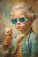 Een humoristisch kunstwerk waarin een barok jongetje in rijk kostuum nonchalant een ijsje vasthoudt terwijl hij stoer een felblauwe zonnebril draagt, wat een vrolijke en speelse sfeer creëert. De combinatie van oude-meesters licht, verfijnde schildertechniek en moderne accessoires zorgt voor een charmant contrast dat meteen een glimlach oproept. Dit werk past prachtig in vintage, modern chic en eclectisch ingerichte interieurs en is een originele blikvanger voor woonkamer, hal, kinderkamer of keuken.