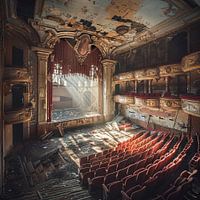 "Whispered Echoes" vangt de melancholische schoonheid van een verlaten barok theater. Het licht dat door de gebroken ramen naar binnen valt, schildert dramatische schaduwen op de stoffige roodfluwelen stoelen en het afbrokkelende toneelgordijn dat ooit weelderige voorstellingen omlijstte. Dit kunstwerk is een emotionele reis door de tijd, waarin het prachtige decor en de vergulde ornamenten stille verhalen vertellen van vergane glorie. Dit schilderij is ideaal voor liefhebbers van barokkunst en theatergeschiedenis en biedt een visuele reflectie op vergankelijkheid en schoonheid.