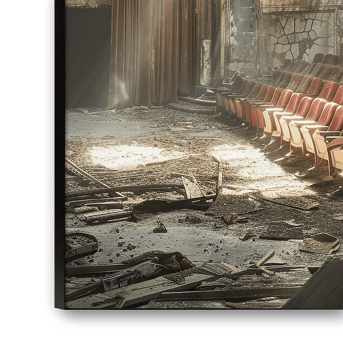 "Whispered Echoes" vangt de melancholische schoonheid van een verlaten barok theater. Het licht dat door de gebroken ramen naar binnen valt, schildert dramatische schaduwen op de stoffige roodfluwelen stoelen en het afbrokkelende toneelgordijn dat ooit weelderige voorstellingen omlijstte. Dit kunstwerk is een emotionele reis door de tijd, waarin het prachtige decor en de vergulde ornamenten stille verhalen vertellen van vergane glorie. Dit schilderij is ideaal voor liefhebbers van barokkunst en theatergeschiedenis en biedt een visuele reflectie op vergankelijkheid en schoonheid.